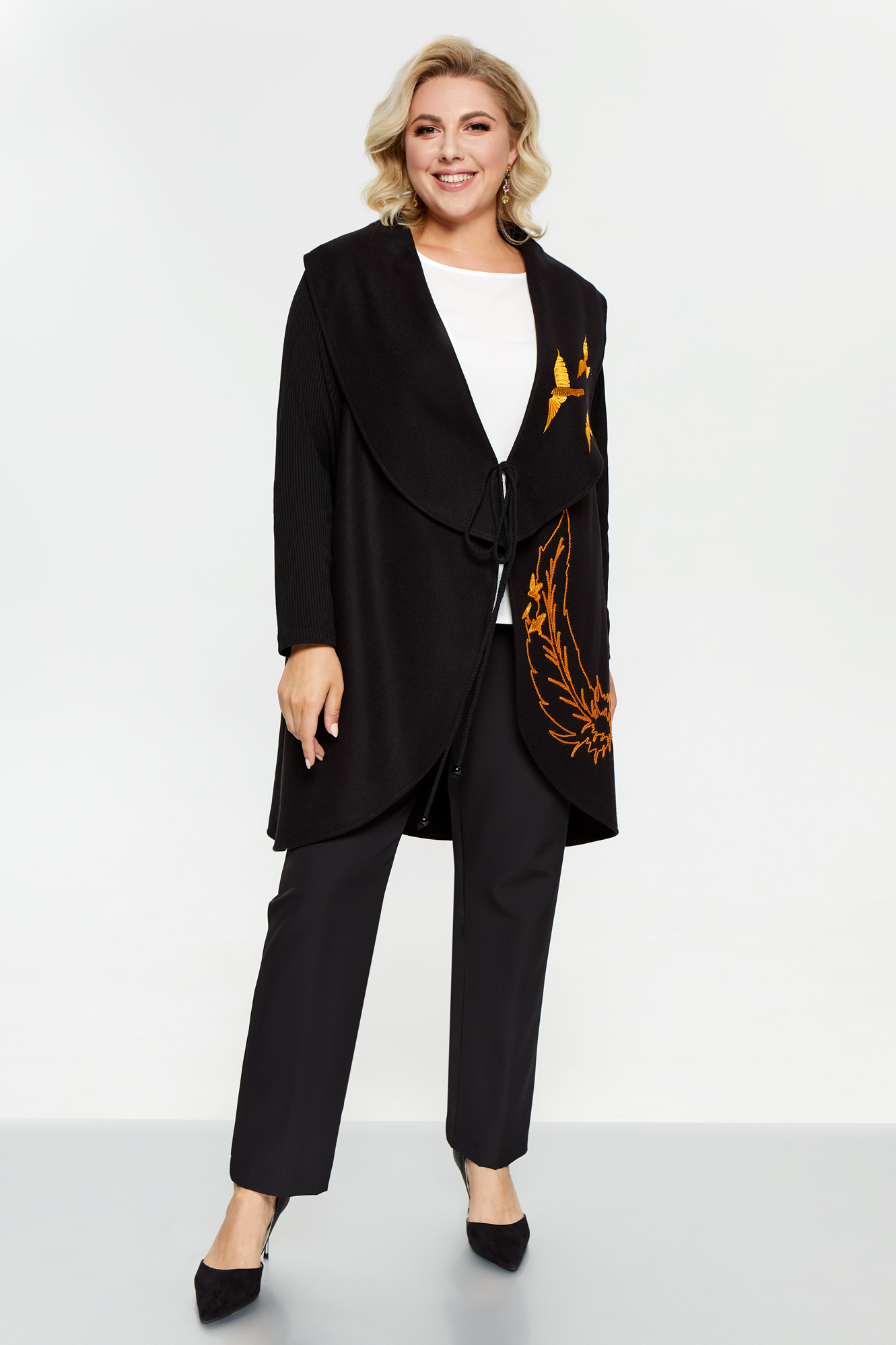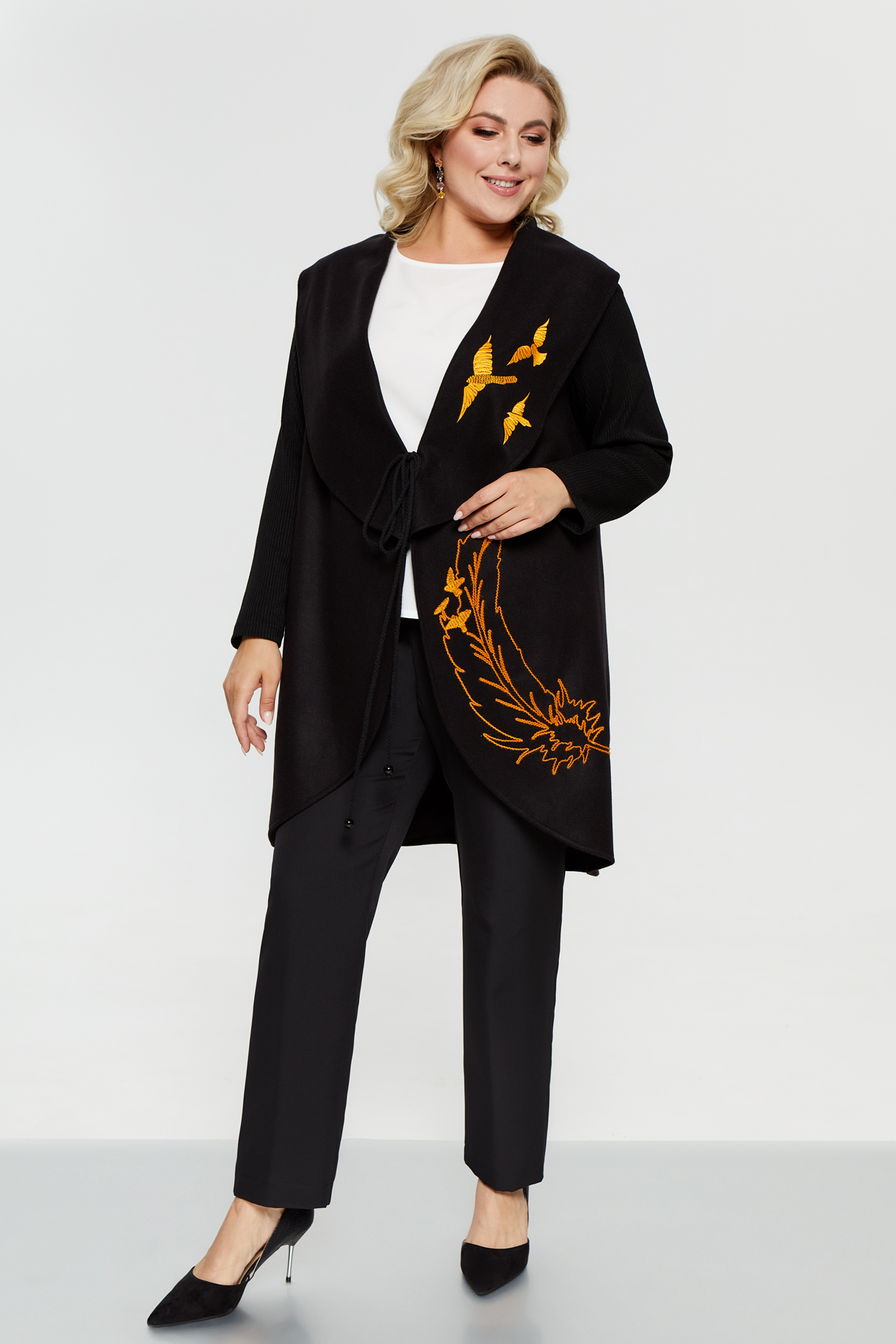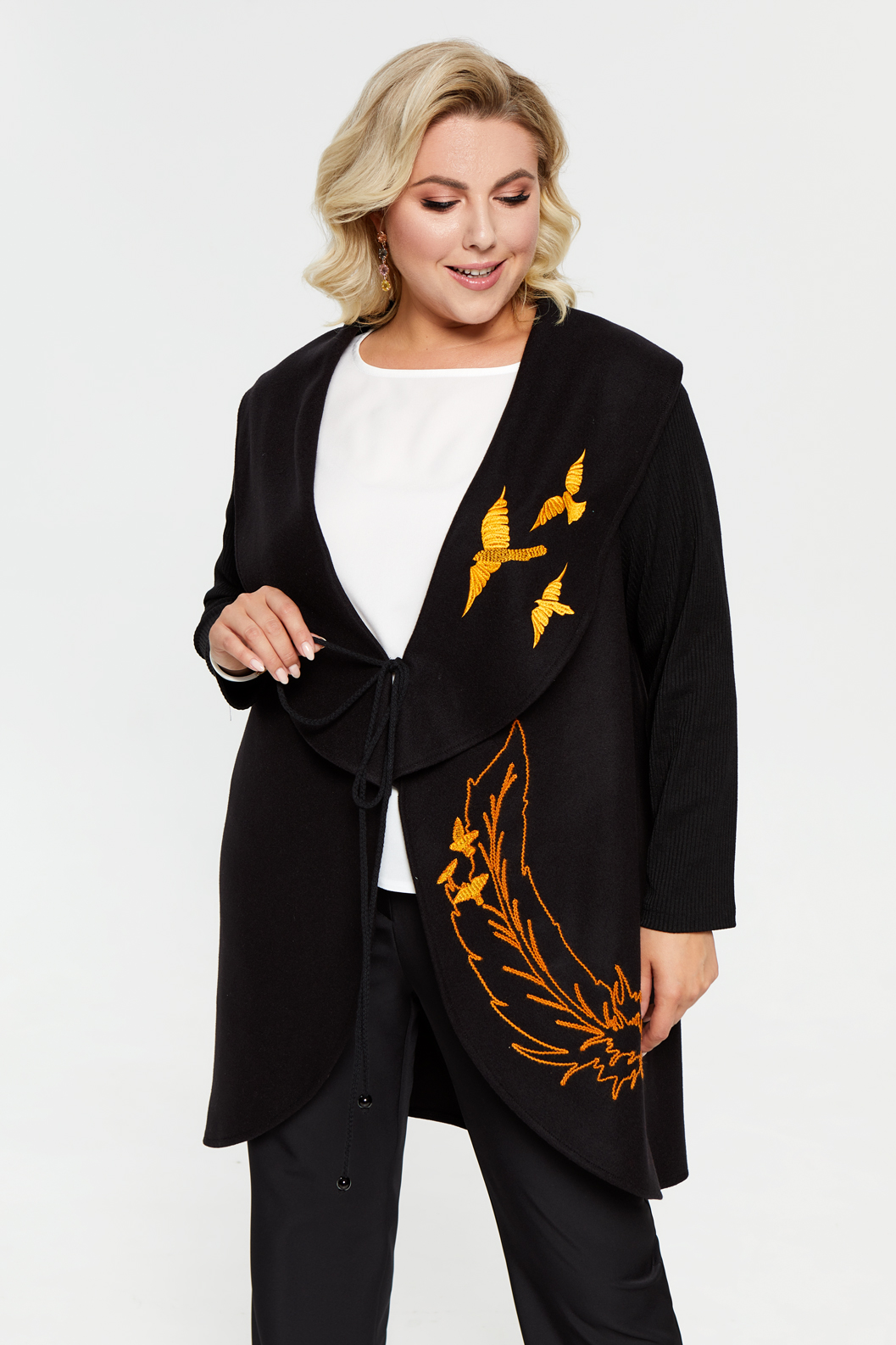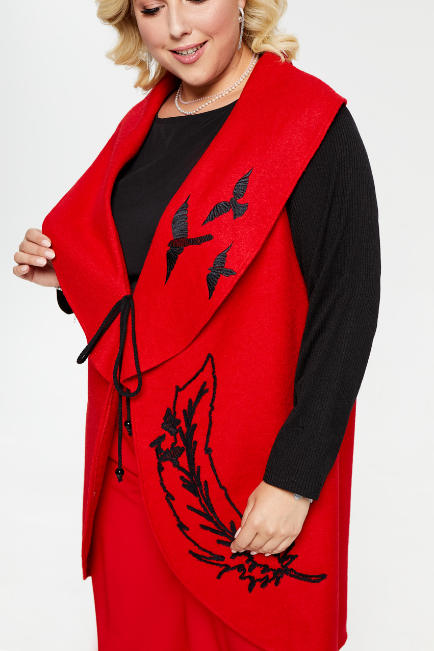 Жакет без подкладки с широким воротником-апаш. Рукава трикотажные. На левой детали переда и лацкане контрастная вышивка. Борта завязываются на шнур.