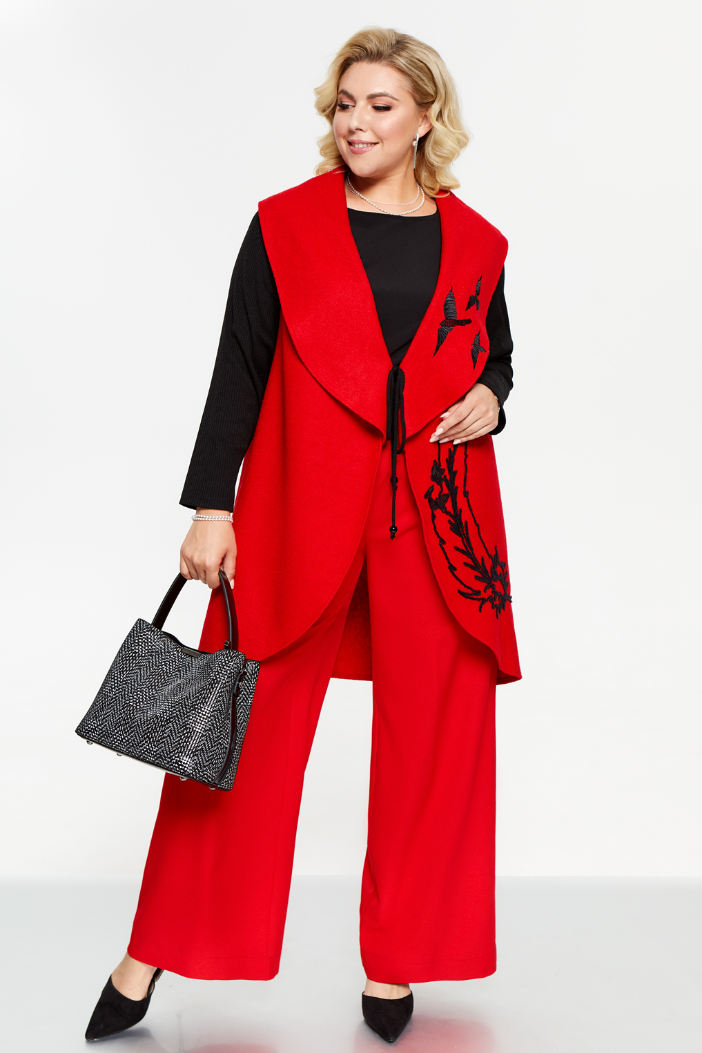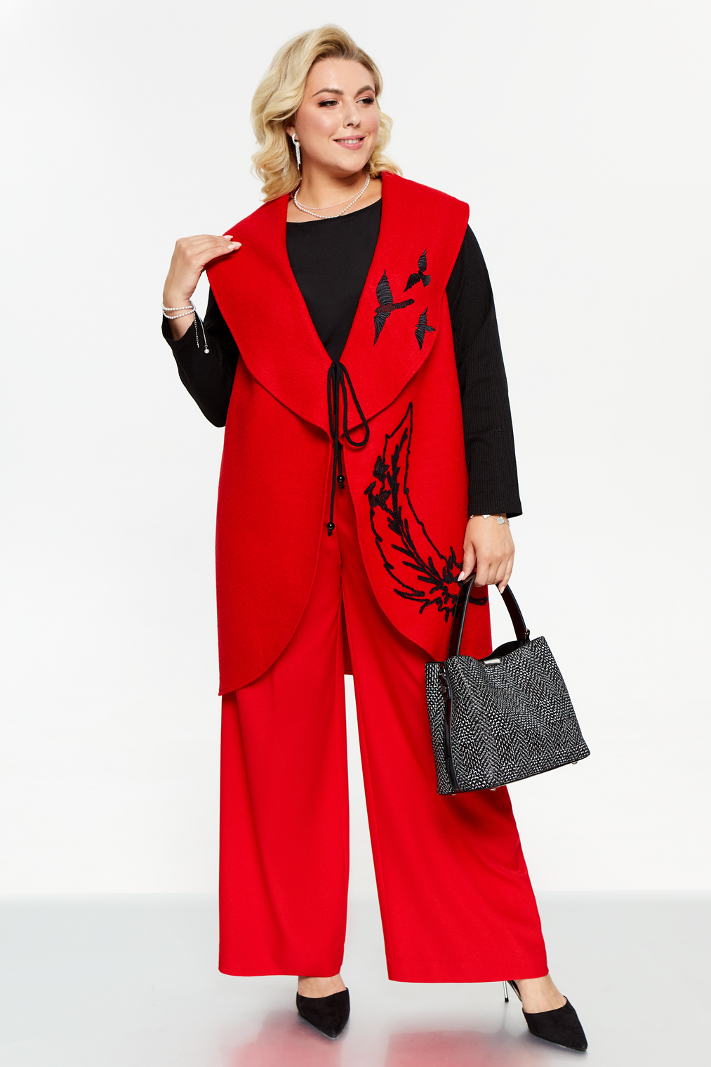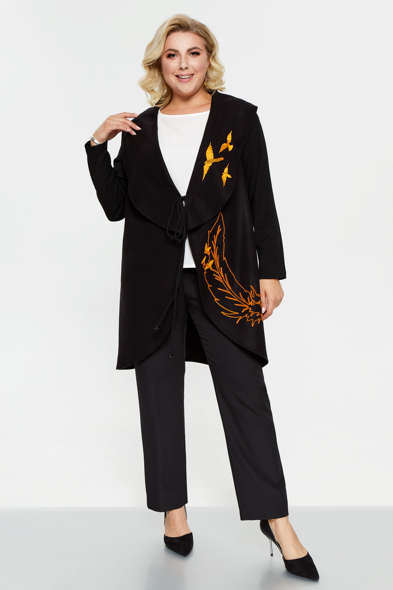 Жакет без подкладки с широким воротником-апаш. Рукава трикотажные. На левой детали переда и лацкане контрастная вышивка. Борта завязываются на шнур.